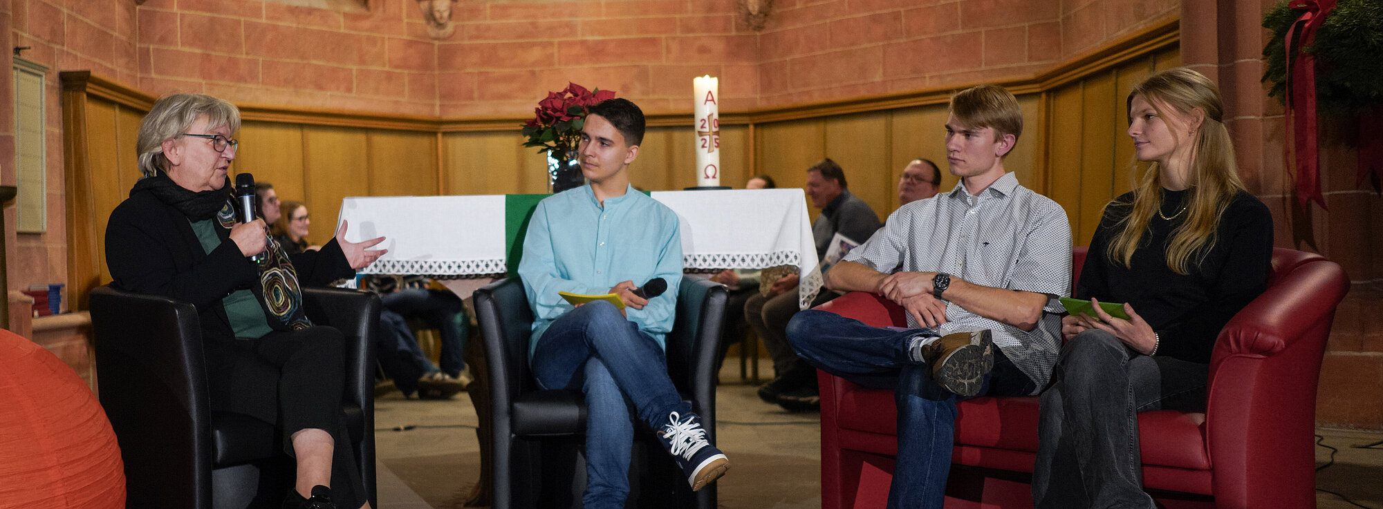 Im anschließenden Interview mit der Kirchenpräsidentin Dorothee Wüst fragten drei Jugendliche nach dem Blick und dem Engagement der Kirche gegen Jugendarmut einerseits und nach der Bedeutung der kommenden Einsparzwänge der protestantischen Kirche für Jugendarbeit andererseits: